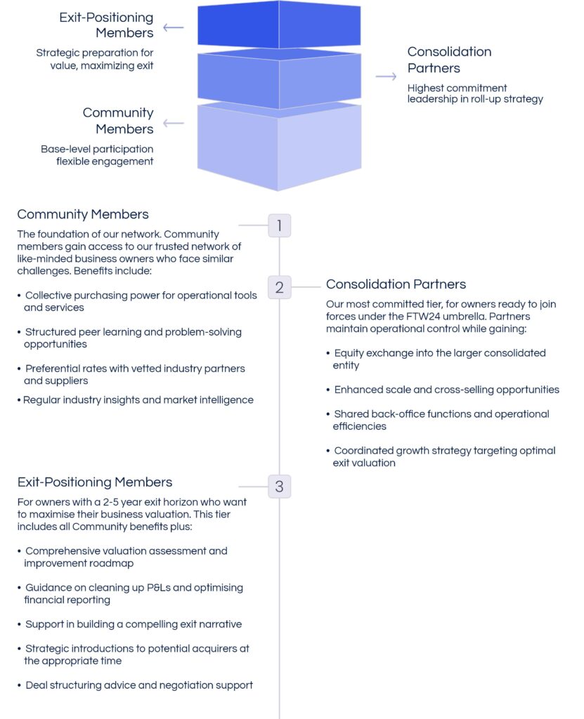 Above all, the FTW24 model is pragmatic, owner-friendly, and focused on delivering tangible benefits at every stage of engagement. Whether you’re looking for community support, exit preparation, or full consolidation, we’ve built a framework that delivers value from day one.